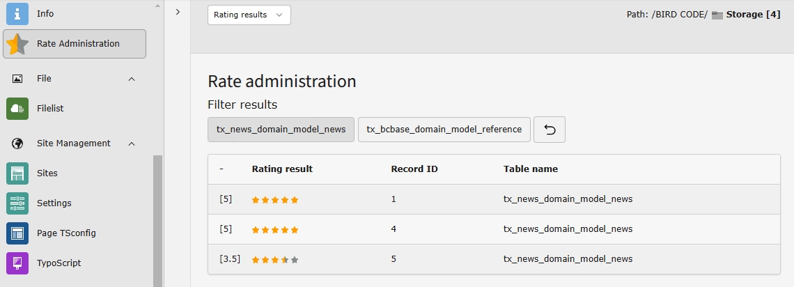 - Update TYPO3 constant and set the value of the plugin.tx_bcsimplerate.settings.storage to the root page or any storage where you want to find Ratings later