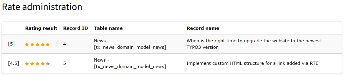 [FEATURE] Introduced a backend module to manage ratings. The BE module allows viewing all single ratings and grouped rating results.